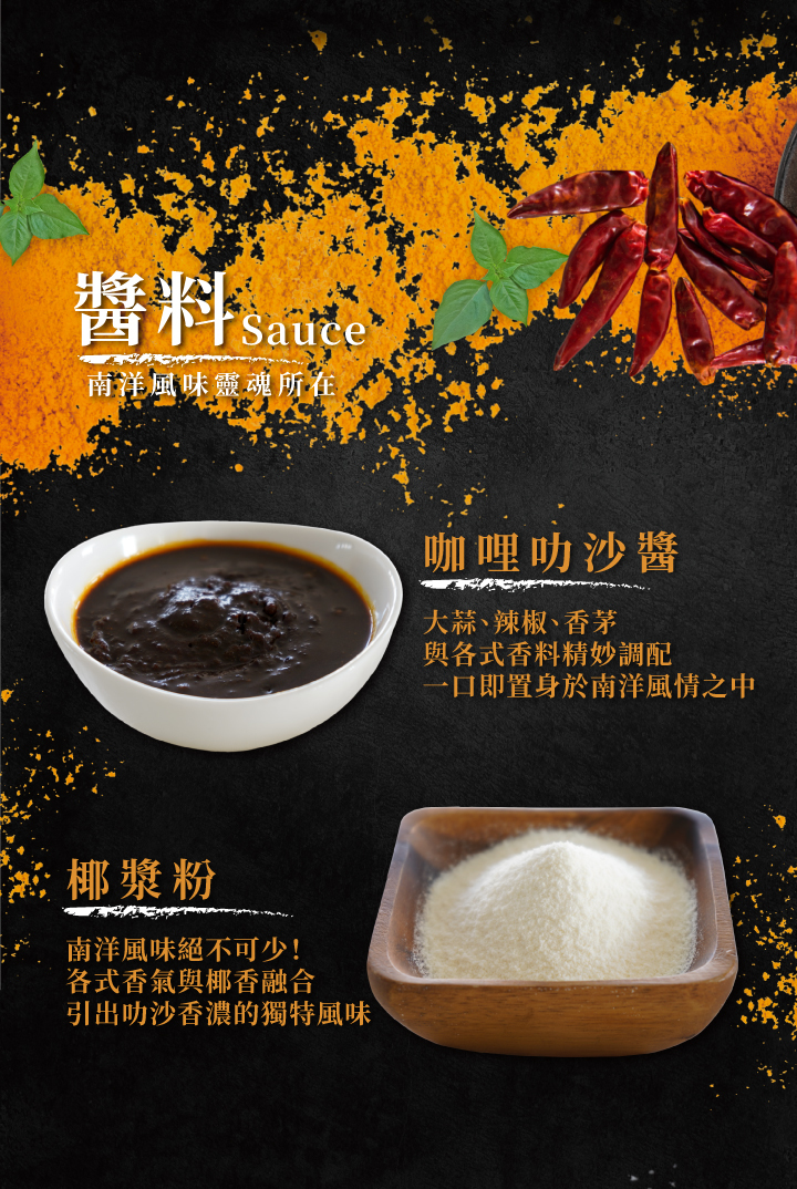 日曬細扁麵拌進含有新鮮椰漿的咖哩叻沙中,細緻濃郁的口感融合在舌尖,溫潤帶甜、濃而不膩,每一口都吃得到屬於南洋咖哩的風味。